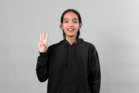 Young Asian man wearing black hoodie smiling while showing three fingers in a hand gesture. Isolated on gray background. Friendly expression, confident and casual appearance.