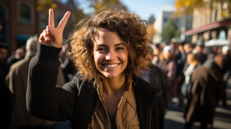 Portrait of a beautiful young woman with curly hair showing victory sign