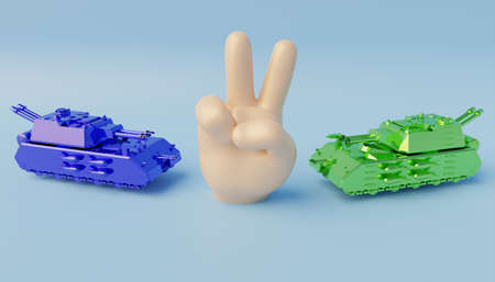 Two armored tank vehicles and a hand symbol of peace-loving piss, 3d illustration.
