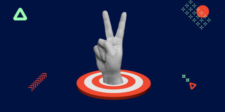 Hand showing V sign on a bullseye, representing personal or business achievement and completion. Minimalistic art collage
