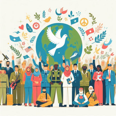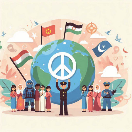 World Peace Day concept. Group of people standing in front of peace symbol. Vector illustration