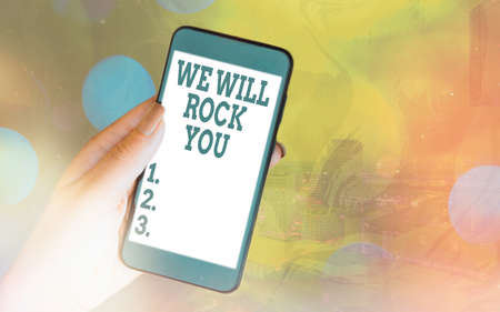 Handwriting text We Will Rock You. Conceptual photo to be going out and facing the world and all that is in it Modern gadgets with white display screen under colorful bokeh background