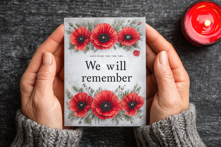 Memorial ceremony with poppies and handwritten notes on a gravestone, trumpet player in the background, and text We Remember.