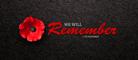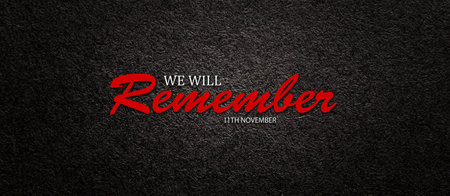 Text We Will Remember 11th November on black textured background. Remembrance Day, Memorial Day, Canada and Great Britain. Banner.