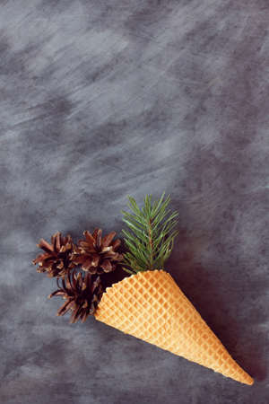 waffle cone with fir branches and cones on the background of the school board / background for the winter holidays