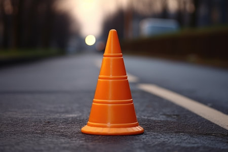 Close-up view of a traffic cone on a road, with plenty of copy space available for text
