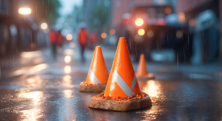 A rainy city street features orange construction cones placed on wet pavement. Blurred figures in safety gear are visible in the distance, creating a busy construction atmosphere.
