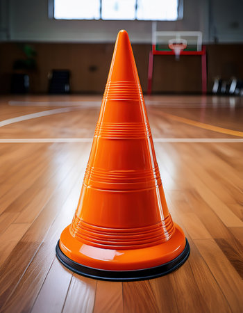 Bright orange traffic cone rests on smooth wooden flooring in a gym filled with sports equipment.