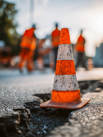 A weathered orange cone sits atop a cracked, uneven pavement as silhouettes of construction workers in reflective gear labor under a warm sunset glow.