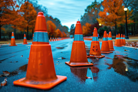 AI Generated. Two orange and white traffic cones are on a wet road