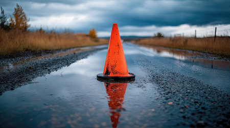 Close-up of a single orange traffic cone on a wet road, with rain puddles reflecting the cone and a cloudy sky overhead. --chaos