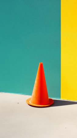 Traffic cone against bright color wall background with copy space, AI Generated