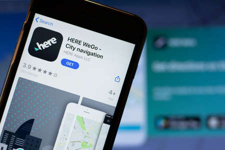 New York, USA - 15 May 2020: HERE WeGo mobile app logo on phone screen, close-up icon, Illustrative Editorial.