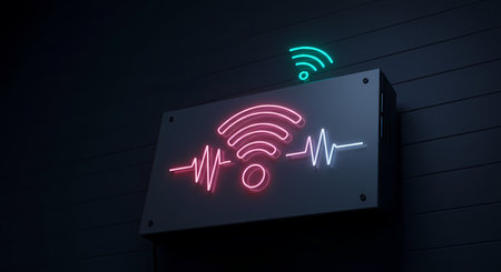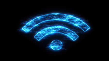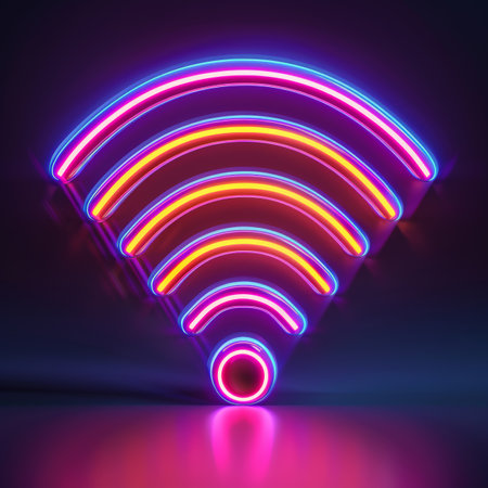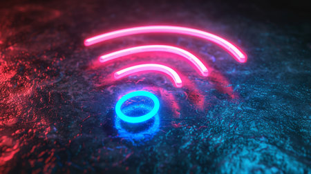 A vibrant glowing wireless signal icon on a black background, symbolizing connectivity and modern technology. Ideal for digital and communication themes.
