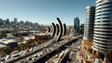 A creative representation of sound waves overlaying a bustling urban skyline. This image captures the essence of city life, featuring dynamic traffic and modern architecture under a clear sky. Perfect for projects involving sound, communication, or urban themes.