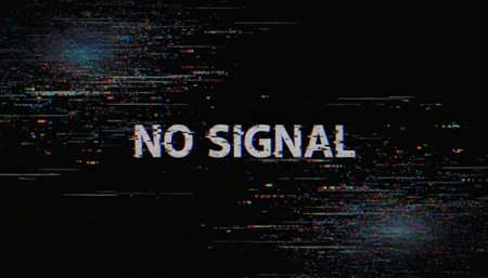 Glitch text no signal appearing on a black digital screen, creating a corrupted data effect with pixelated noise and distorted lines, representing technical issues and communication problems