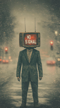 Person in a suit with a TV head and No Signal message in a city