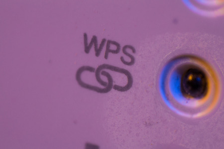Macro closeup on WPS symbol signal connection status led light. The WiFi repeater device is in electrical socket on the wall. It help to extend wireless network in home or office.