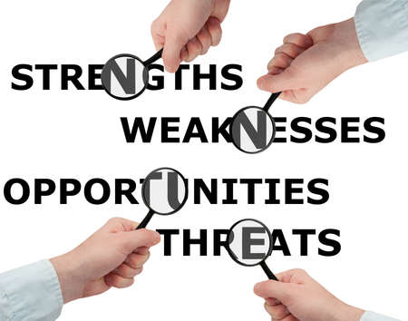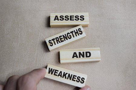 Assess strengths and weakness on stacked wooden cubes on the table. Business and finance concept