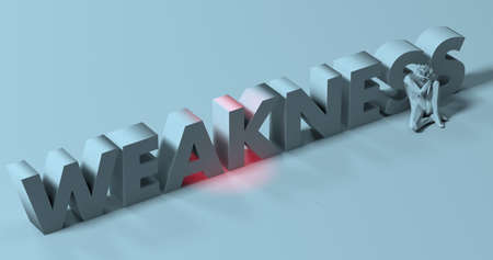 Flawed depressed man sitting near Weakness text sign, 3d render illustration