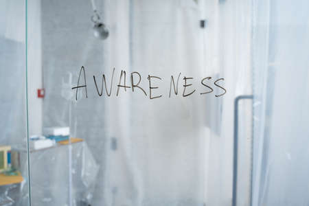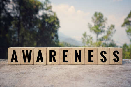 Motivational and inspirational word - ‘AWARENESS’ written on wooden blocks. Blurred styled background.