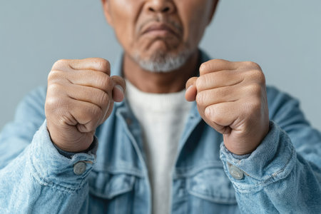 Person showing clear signs of aggression: clenched fists, angry expression, and tense body language in a confrontational street or indoor environment.