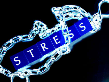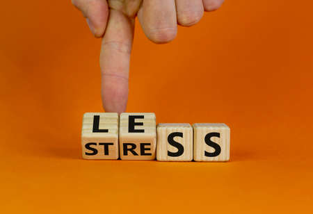 Having less stress or being stress-less. Male hand turns wooden cubes and changes the word 'STRESS' to 'LESS'. Beautiful orange background, copy space. Medical and lifestyle concept.
