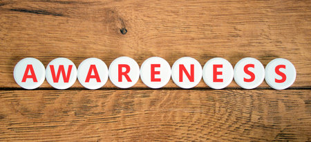 Awareness symbol. Concept word awareness on beautiful white circles. Beautiful wooden background. Business education awareness concept. Copy space.