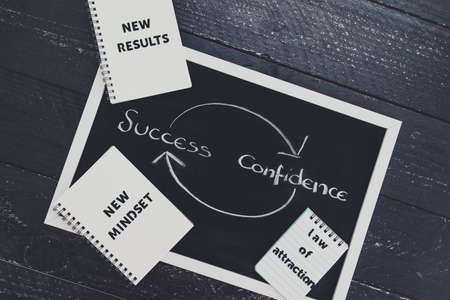 from confidence to success and repeat sign on blackboard with arrows, psychology and mindset shift concept