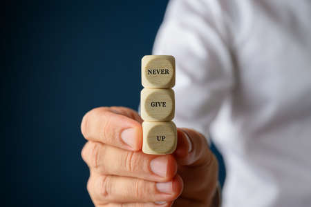 Male hand holding wooden dices carrying a Never give up sign in a conceptual image. Over navy blue background.