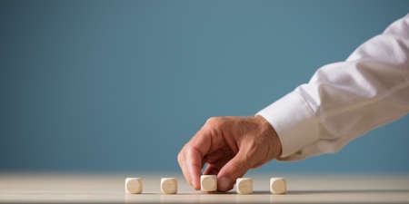 Hand of a businessman placing five blank wooden dices in a row on wooden desk. Over blue background with copy space.