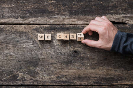 Conceptual image of positive personal attitude - male hand changing a We cant sign into a We can! sign.