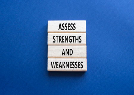 Strengths and Weaknesses symbol. Wooden blocks with words Assess Strengths and Weaknesses. Beautiful deep blue background. Business and Assess Strengths and Weaknesses concept. Copy space.