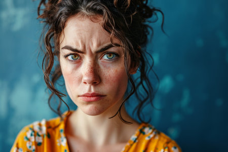 Young Adult with Curly Hair Showing Expression of Anger and Frustration Against Plain Background in Portrait Mode