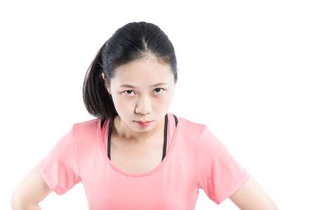 Portrait of unsatisfied asian woman standing with arms folded isolated over white background