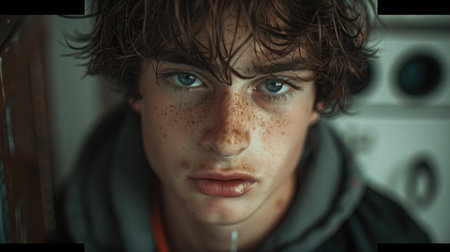 A candid realism photo portrait captures a guy with multiple freckles on his face, showcasing his natural charm and features in an unposed, banner
