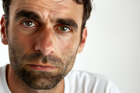 Portrait of adult bearded man with emotion of saddness on face looking at camera