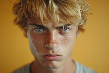 A blond man with an angry expression against a yellow background