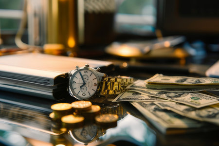 A luxury watch and a stack of cash on an upscale desk, symbolizing the correlation between time and money.