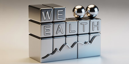 Silver blocks spelling the word WEALTH are stacked with silver spheres and a rising graph etched on them.