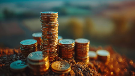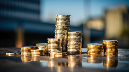 A series of coins organized in progressively taller stacks, representing financial growth and investment potential, set against a minimalistic light background.