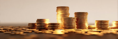 Stacks of glaming golden coins arranged neatly with soft 3D lighting illuminating their surfaces, conveying a rich and prosperous atmosphere