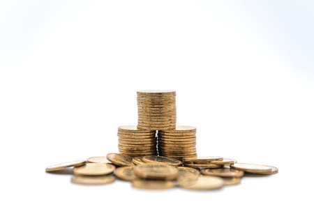 Money and Financial Concept. Closeup of stack and pile of gold coins on white background.