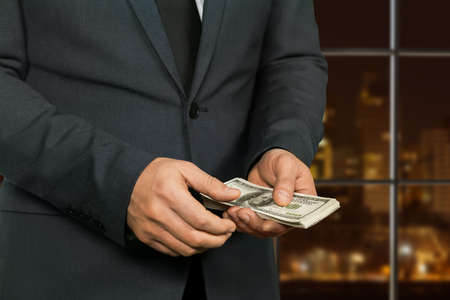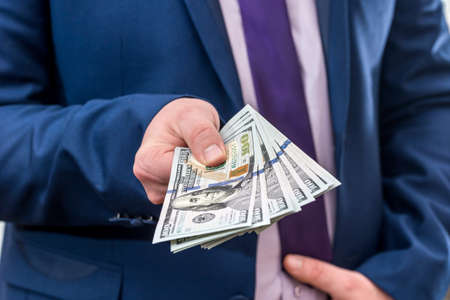 A man in a suit offers a bribe for a product or service. Businessman holds and gives dollars. Corruption or salary.