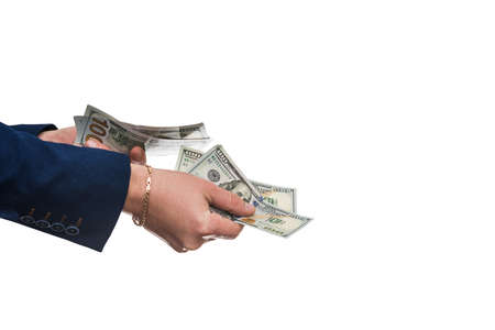 Businessman buying or renting a product or service, giving dollars, isolated on white. The male hand offers a bribe
