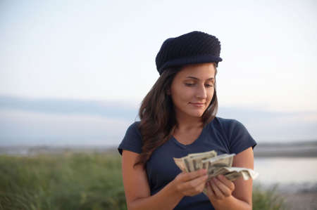 Woman counting money, US dollars