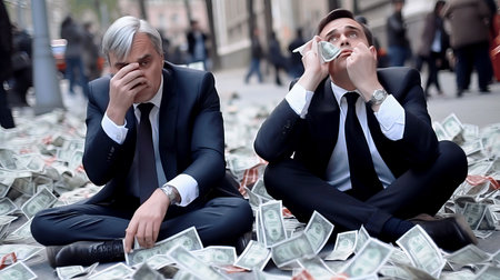 Two businessmen in suits express their emotions while sitting on a street surrounded by cash. Their body language reflects stress and anxiety amid a financial setback.