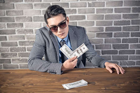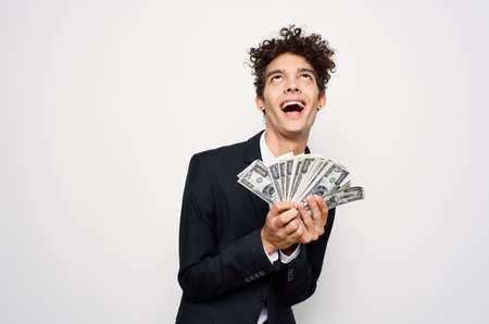Cheerful man in a suit with money in the hands of a finance official