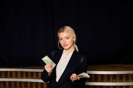 Beautiful blonde businesswoman with money at loft office in black suit.