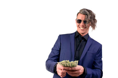 a rich man in a classic suit on a light background with a bundle of money in his hands